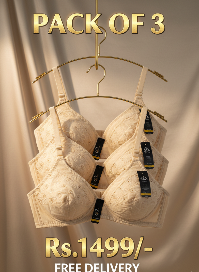 Upgrade your everyday comfort with this 3-Piece Chikan Embroidered Cotton Bra Pack. Crafted from soft, breathable cotton, these bras are lightweight, non-wired, and super comfortable for all-day wear. The delicate chikan embroidery adds a stylish, elegant touch that makes daily dressing feel special.